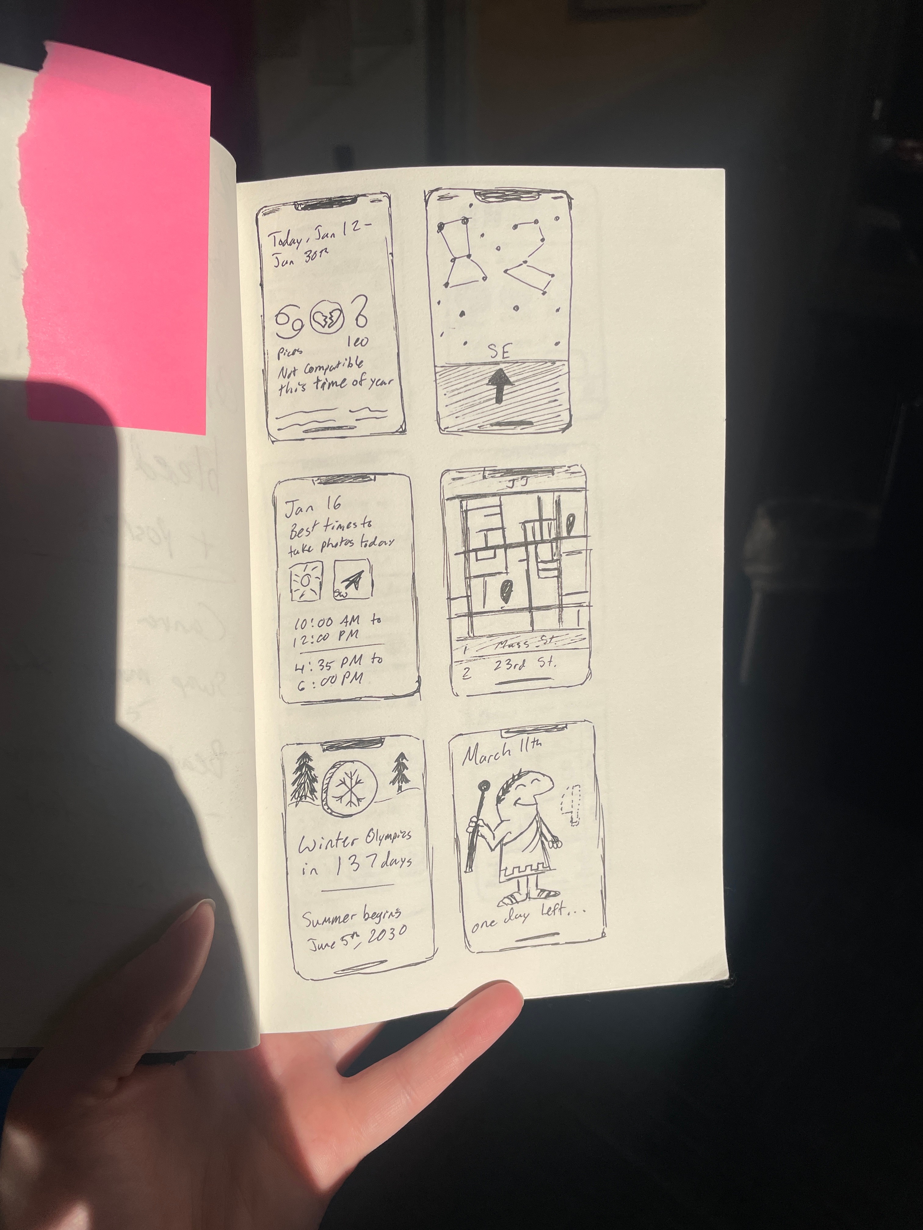 The first step of the project was to create a list of 20 ideas for a clock, calendar, or compass as well as thumbnail sketches to go with them.